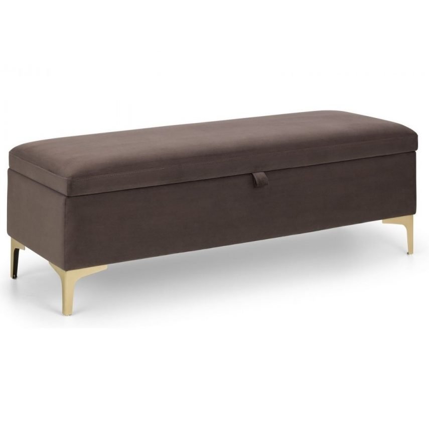 Perfectly proportioned to sit at the end of the Deco bed, this contemporary Deco blanket box is upholstered in a truffle velvet fabric with complimentary gold metal legs. This contemporary design offers a unique, timeless appeal. The perfect storage for your cushions, linens, or duvets with the ease of soft close hinges.