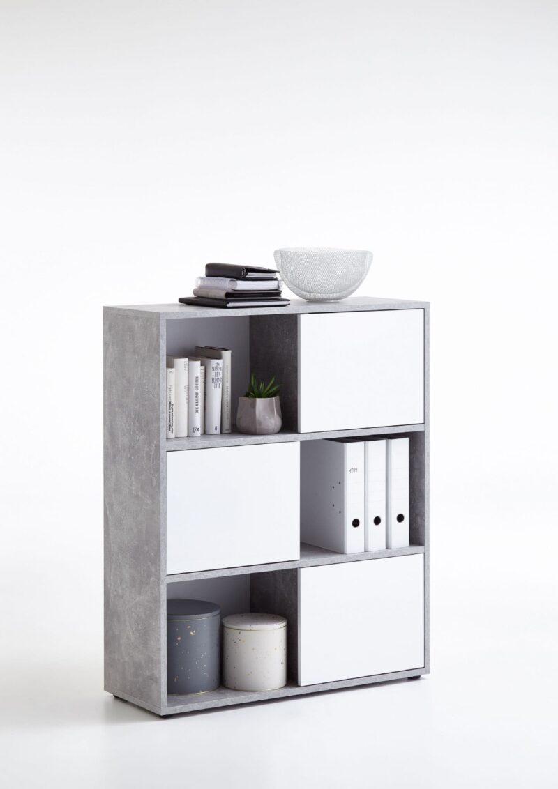 The Rocha Melo Concrete Grey and White Short Bookcase offers a stylish storage solution for your living space. With three doors and three open storage compartments, it provides versatile storage options for books, decor, and other essentials. Its modern concrete grey and white design adds a contemporary touch to any room while keeping your belongings organized and easily accessible.
